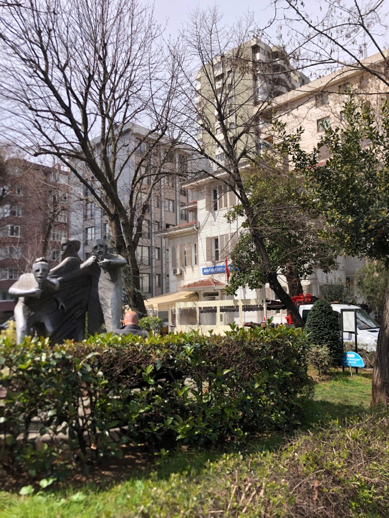 Yürümeyi severim.. durmadan yürüyorum her gün.. insanları seyrederek, çevreye, ağaçlara, tarihi yapılara.. Ziverbey‘deki tiyatro heykellerine, tarihi beyaz köşklere.. bakarak yürüyorum.. Bugün de durmadan yürüdüm.. resim kağıtlarım bitmişti.. okula uğrayıp, depremzedeler için sergi organize edilmişti onun için resim ayarladım.. Sonra çıkıp Kadıköy’e doğru yürümeye başladım.. Güzel bir güneş vardı.. Ziverbey’deki tiyatro heykeli güneş altında parlıyordu…