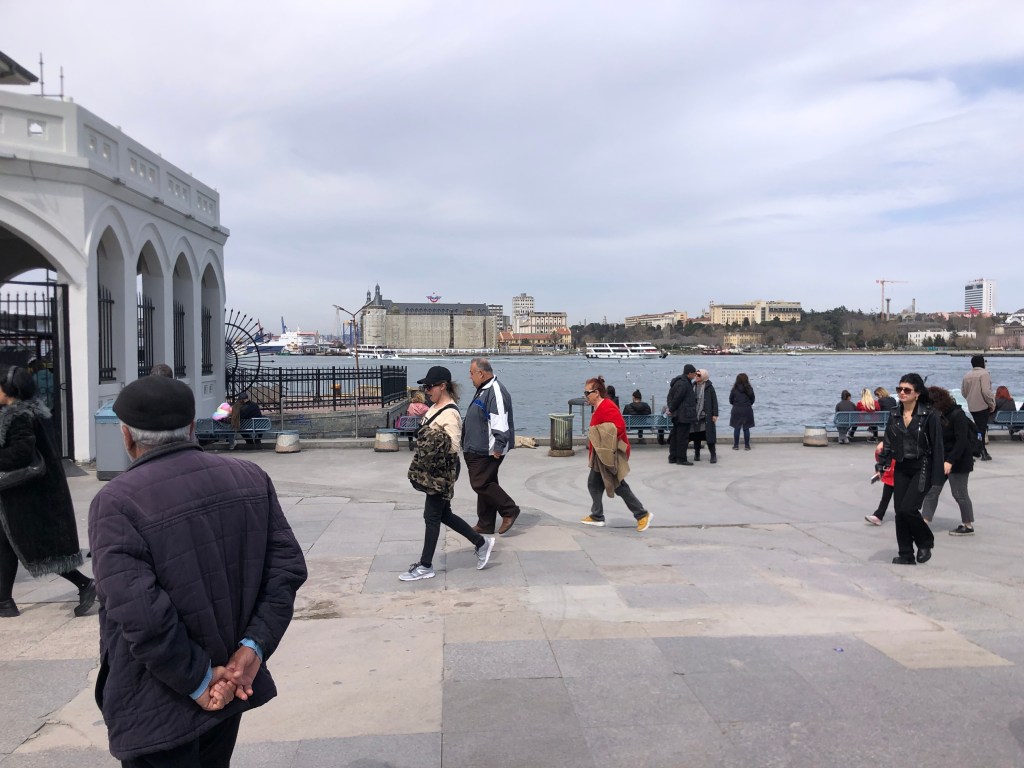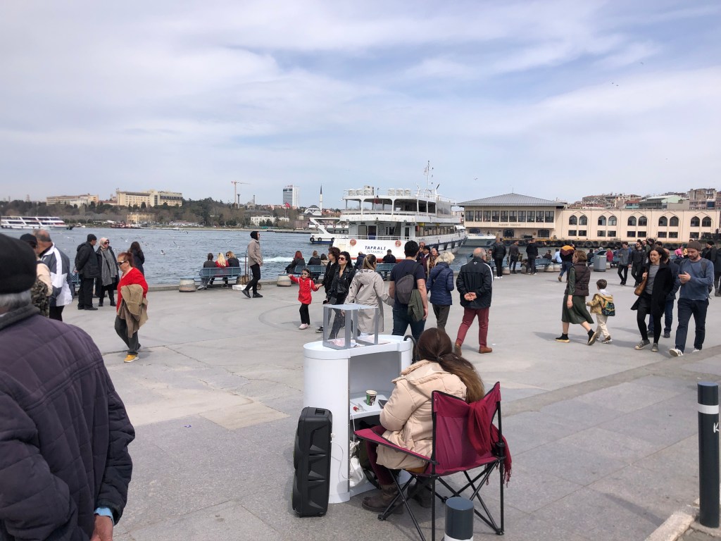 Karşımda eşsiz bulut kümesi, tarihi beyaz iskele..gidip gelen insan kalabalığı.. birikenler kaldırımlarda.. bakımsız ağaçlar ve restorasyonu bir türlü bitirilemeyen tarihi yapılar.. sonra direkler.. anlamsız bir sürü direk… Bozuk kaldırımların üstünde hızlı adımlarla yürüyen gençler, yaşlılar, kadınlar, erkekler… bir köşede.. simitçi, kestaneci…