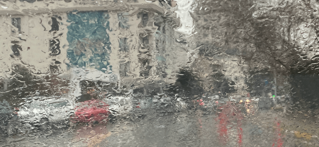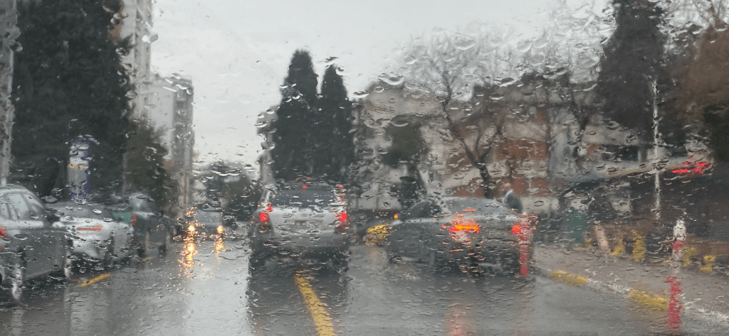 Şekiller değişiyor, görüntüler bir beliriyor bir kayboluyor.. koyu açık yeşil ağaçlar.. ilerdeki apartmanların gri gölgelerini görüyordum.. kırmızı çizgiler beliriyor, ilerdeki neonların ışıkları da ıslak yollara düşüyordu.. gökyüzünün de kül rengi yeryüzüne inmişti.. hareket vardı her tarafta.. yaşamın dengesi de ortaya çıkıyordu…