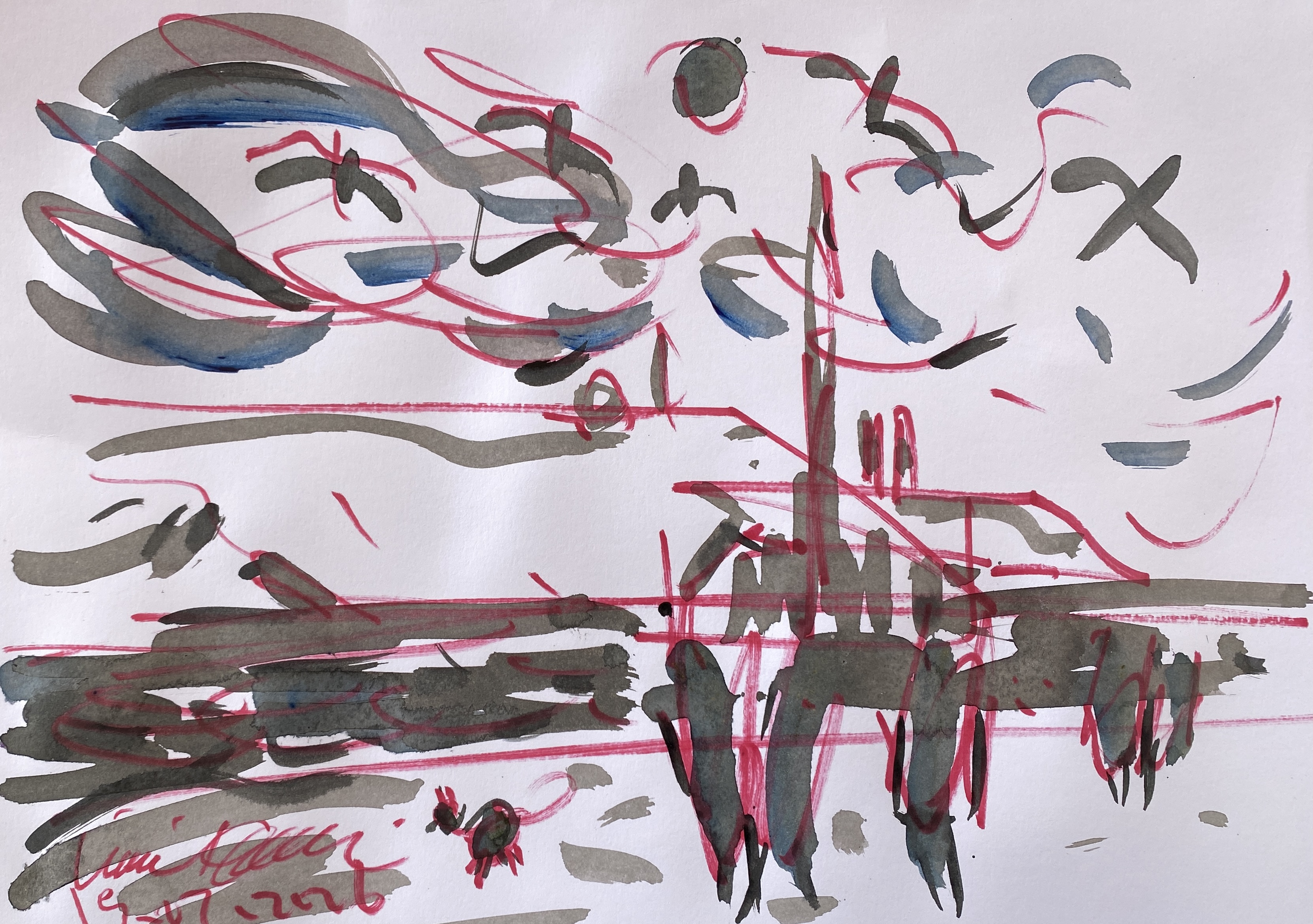 Geçenlerde Piyer Loti’ye gittim.. Eyüp’e.. baktım insanlar da teleferikle yukarıya çıkıyor, mezarlıklar aşağıda kalıyor ve kimler kimler yok ki mezarlarda hayret ediyorsun.. ne alimler ne şairler, ne ünlüler, politikacılar.. yukarıya çıkıp bir masaya oturdum, çayımı kahvemi içerken Haliç’e baktım oradan.. evler, köprüler, camiler süzülüyordu Haliç kenarında.. kırmızı kalemle çizdim ve daha sonra da boyadım tek tonda.. olabildiğince koyulukları açıklıkları gözeterek yaptım bunu…
