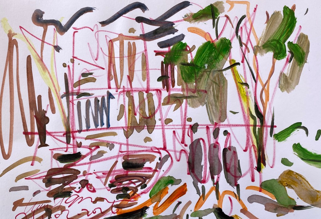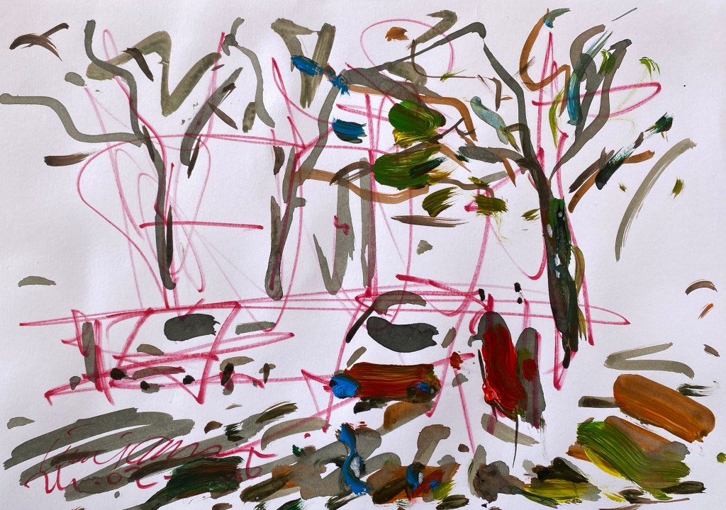 İlkönce kalemle çiziyor, sonra da fırçayla çiziyorum.. renkler de çizgi çizgi oluşuyor, bazen kalın gölgeler veriyorum.. bazı yerlerde yoğunlaşıyor boyalar, bazı yerlerde çizgiler artıyor, değişiyor.. gerilere gidince azalıyor çizgiler ve böylece perspektif duygusu, derinlik hissi devreye giriyor.. çizgisel bulutlar ve ön planda araçlar, insanlar var.. sağ tarafta ağaçlar yarı görünür vaziyette hareket kazanıyor…