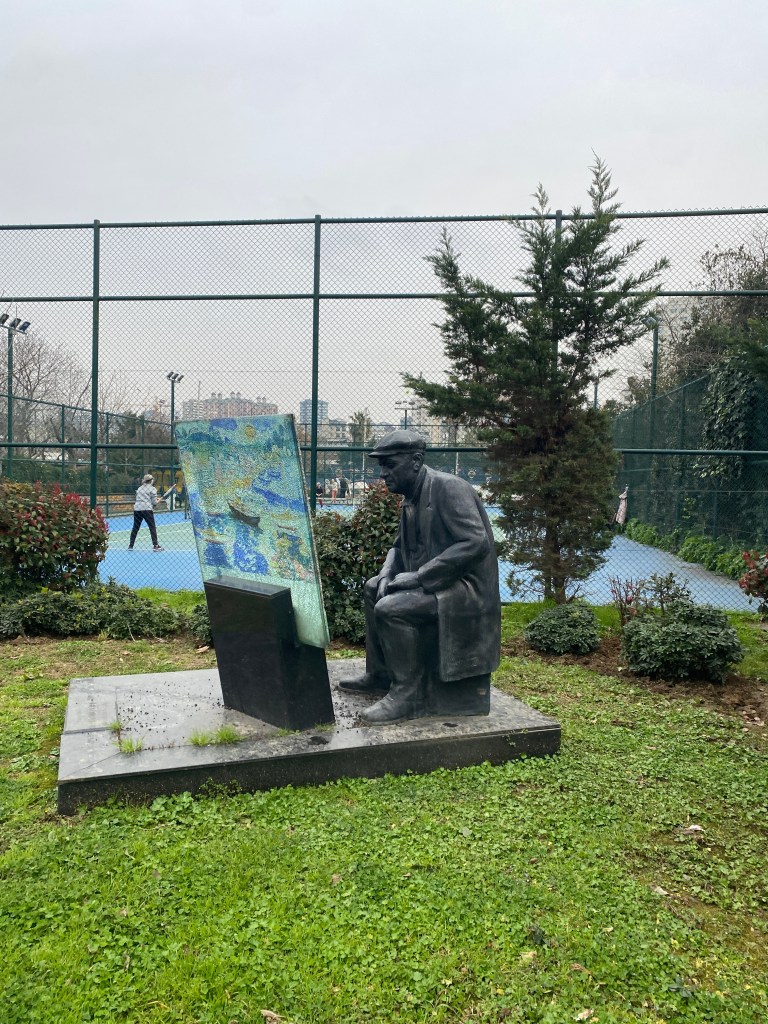 Fikret Mualla’nın heykelini gördüm.. ressam tabureye oturmuş yaptığı resme bakar vaziyetteydi heykel.. arkasında da tenis oynayan kadınlı erkekli bir grup vardı.. sonra gökyüzü burda da gri renklere bürünmüştü.. çimenlerin üzerindeydi heykel.. çalı çırpı vardı yanında yöresinde ve hemen küçük bir de ağaç vardı…