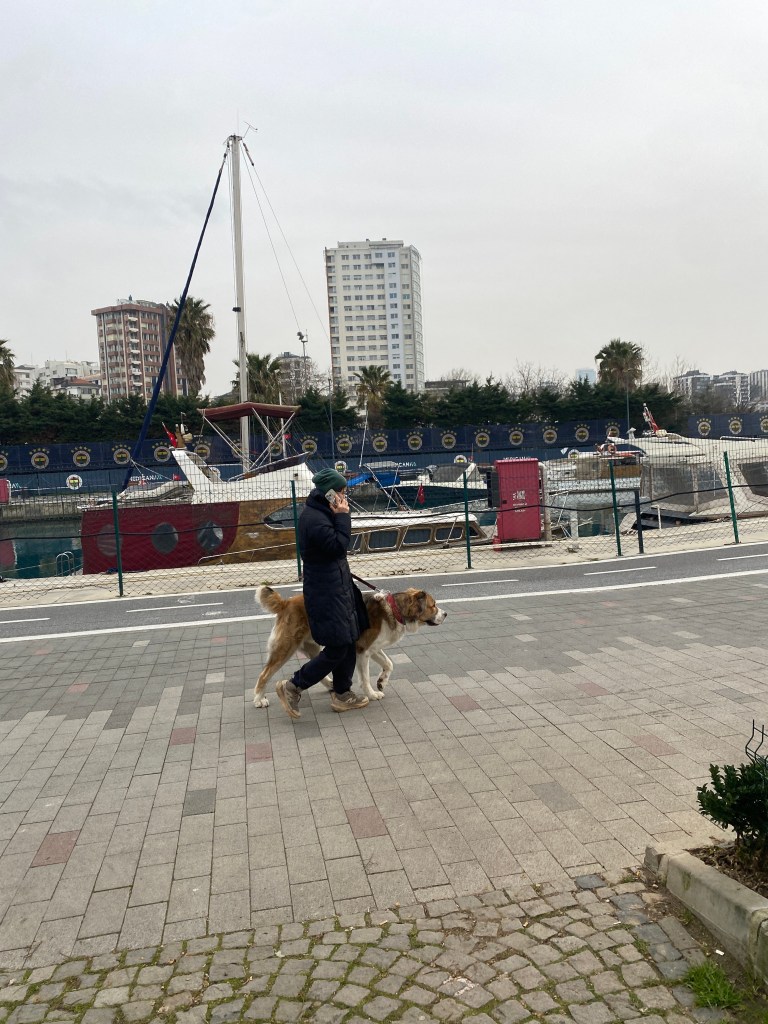 Büyük bina küçük bina.. sararmış gökyüzü ve Kurbağalıdere’de yelkenleri indirilmiş tekneler görüyordum.. ayrıca limanda kocaman köpeğiyle yürüyen bir kız vardı.. türlü tekneler de yüzüyor derenin içinde.. kahverengi beyaz koca köpek sahibinin yanında meraklı ve ileriye bakarak kesik kuyruğuyla ilerliyordu…